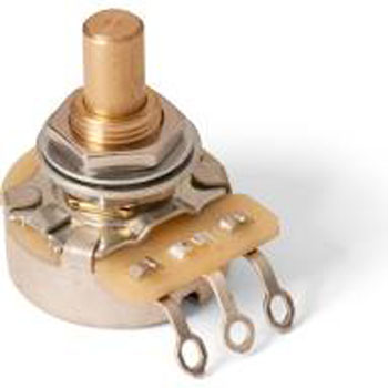 A pot has a resistance value that determines how much of the signal is bled to ground. The most common values for guitar pots are 250K and 500K. The higher the value, the more treble you will hear. In guitars, there are two taper types that are used in guitars more than any other. 1) Logarithmic, commonly known as an audio taper, and 2) Linear: with it's taper, treble cuts off quickly early in the turn of the knob. With an audio taper, the treble decreases much later in the turn. A 250K pot is generally the most useful resistance value for a bass guitar. Many bass pickups sound best when connected to a 250K volume pot. At full volume, there is plenty of treble response that’s suitable for all playing styles. New strings sound great, old strings sound great, fret clack is there for slap style, and so on. What would happen if you installed a 500K or greater volume pot? You’ll get more treble response, but probably not the kind you would appreciate. It will be an “ice pick” like sound that’s harsh to the ears, even for something as simple as string drag noise when you move your fret hand from fret to fret. An audio taper volume pot is the most useful for a bass player. For bass players, the audio taper volume pot is preferred because you get use out of almost the whole turn of the knob.